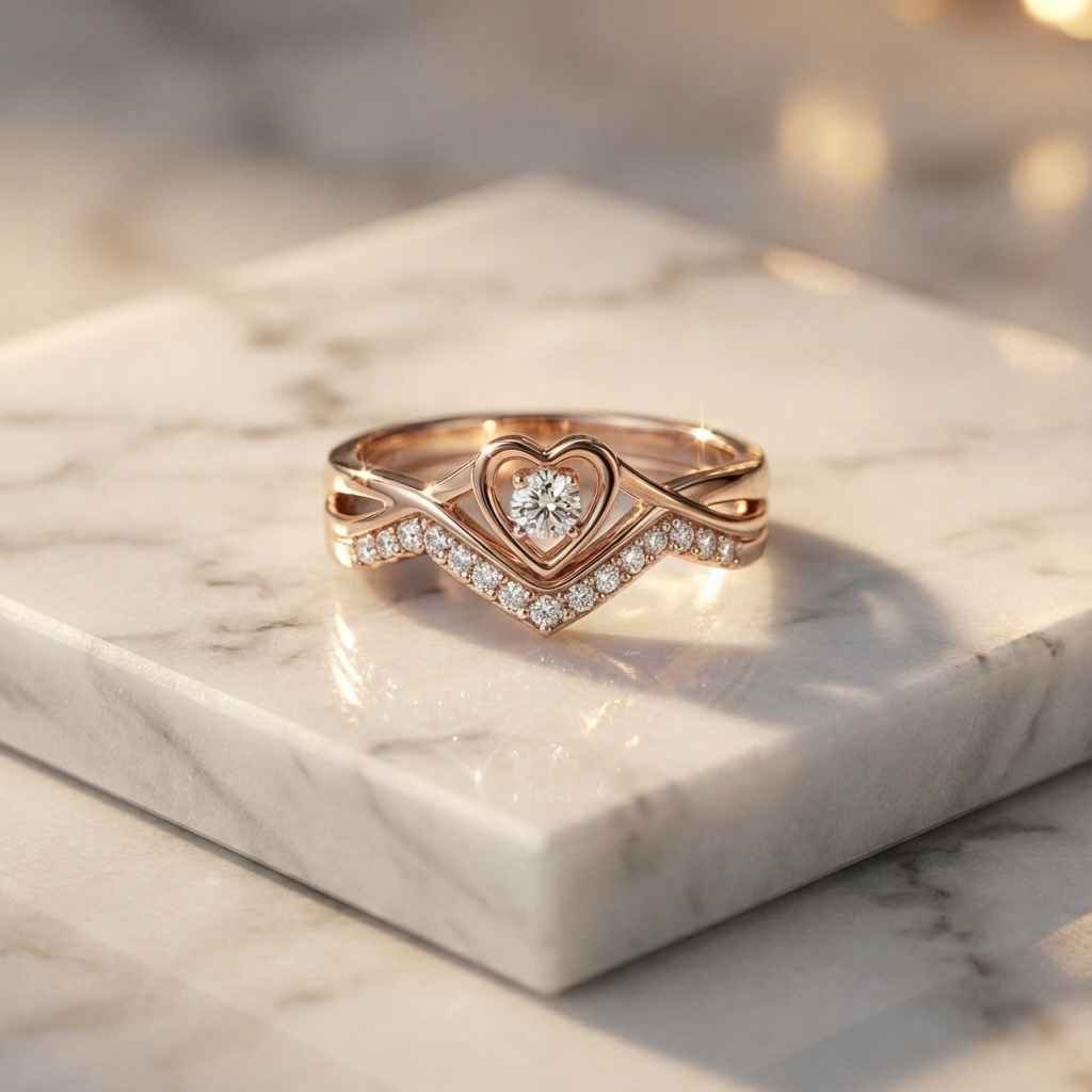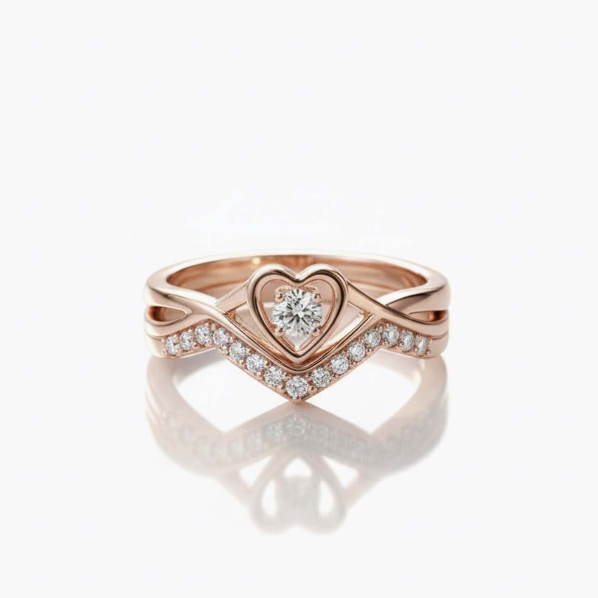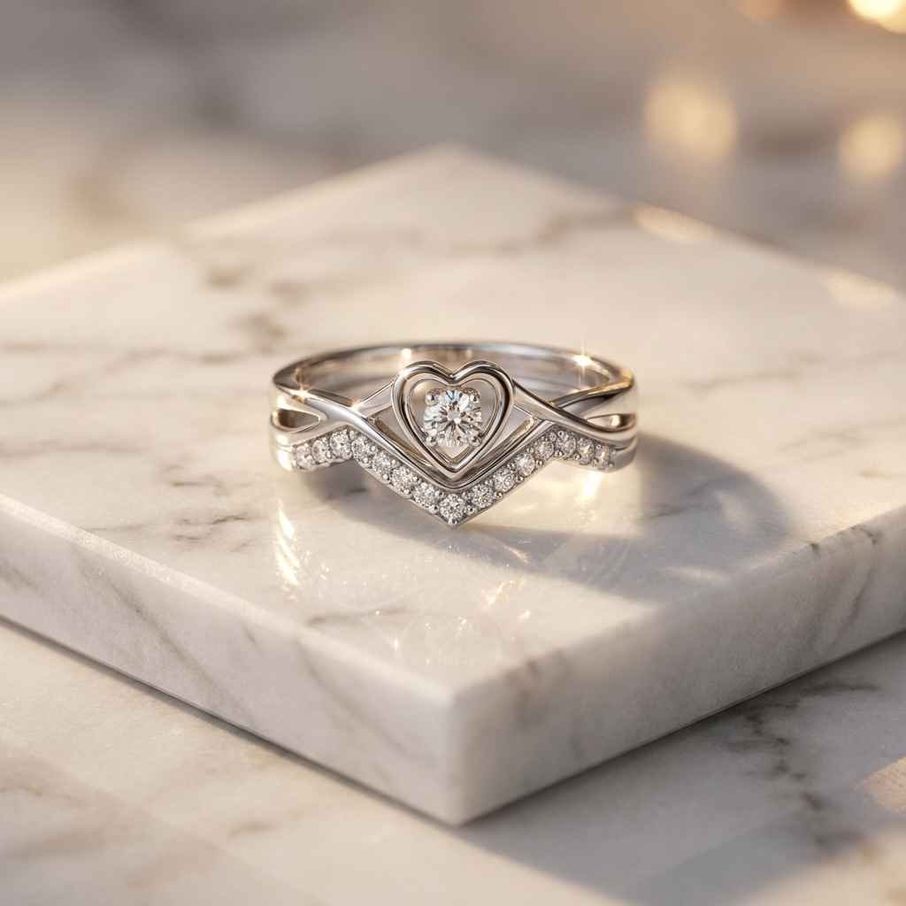 Celebrate love with this romantic 0.80 carat total weight CVD diamond heart-shaped ring, designed in polished 10K white gold. This feminine double-band ring features a delicate heart motif cradling a brilliant round center diamond, accented with a chevron-shaped row of sparkling stones. The layered design adds depth and elegance, making it a perfect promise ring, engagement ring, or meaningful gift for her. Crafted using lab-grown CVD diamonds and certified by SGL (IGI available on request), this ring blends modern ethics with timeless charm.