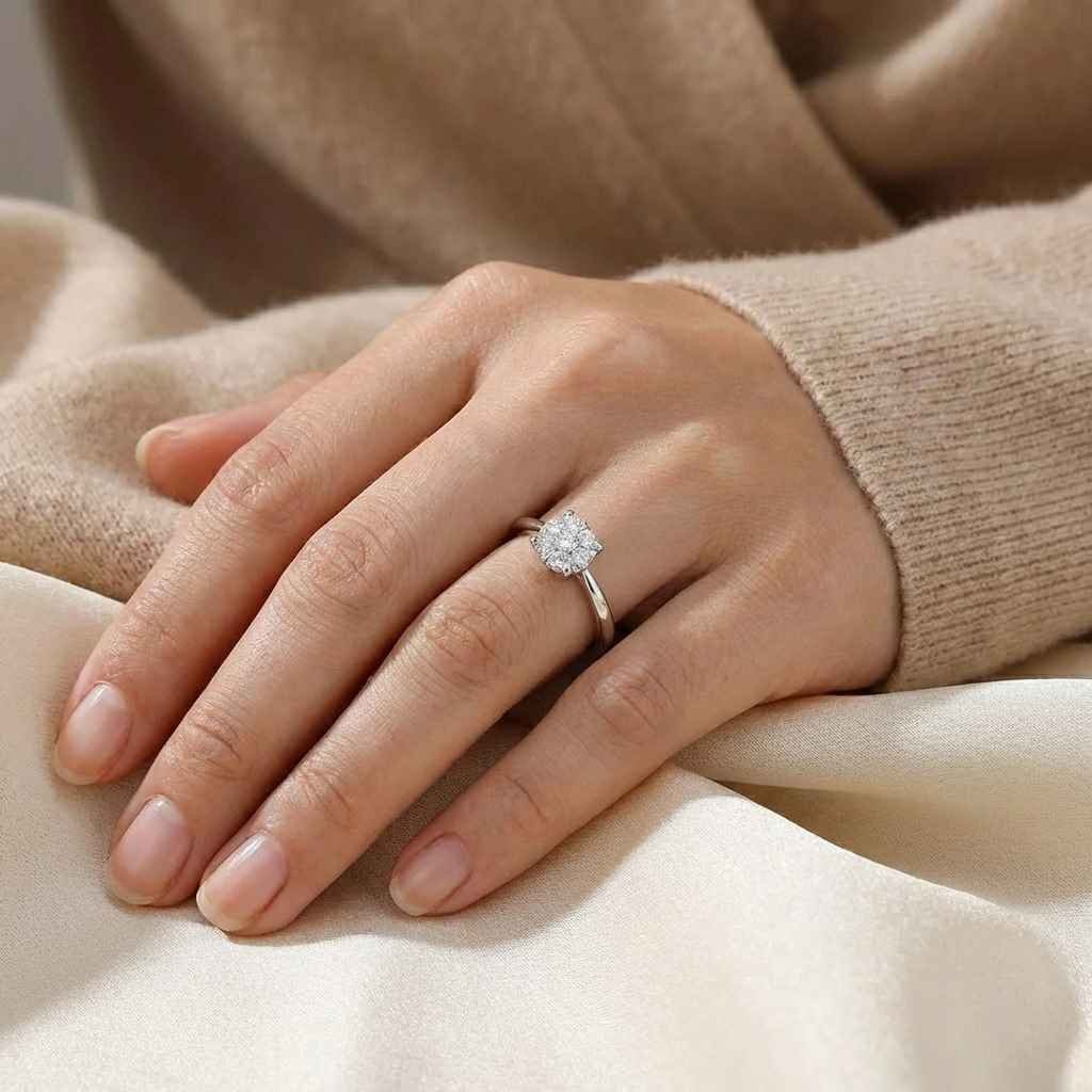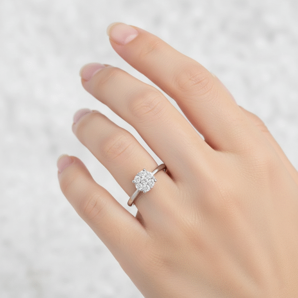 A timeless symbol of beauty and grace, this 0.80 carat total weight diamond ring features a floral cluster of seven round brilliant CVD diamonds, arranged to mimic the look of a single larger stone. Crafted in 10K, 14K, or 18K gold (available in white, yellow, or rose), this elegant ring is the perfect gift for birthdays, anniversaries, or daily wear. Set in a classic prong setting on a smooth polished shank, this piece is both subtle and stunning. SGL certified with IGI certification available on request.