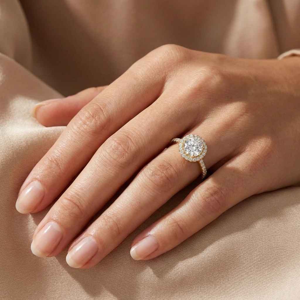 Experience breathtaking sparkle with this 1.26ctw round lab-grown diamond halo ring from shopneez. This exquisite ring features a brilliant 1.03ct center stone, surrounded by a radiant halo of diamonds.