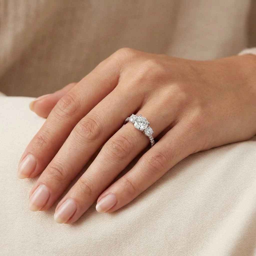 Celebrate your Past, Present, and Future with this magnificent 2.40 total carat weight (ctw) Round Cut Lab Grown Diamond Three Stone Ring. The dazzling central Round Brilliant diamond is flanked by two perfectly matched round side stones, all set on a continuous Pavé Diamond Band. This design maximizes sparkle and brilliance from every angle. Crafted in elegant 14K Gold (available in 10K/14K/18K), this ring offers a beautiful blend of classic symbolism and luxurious size. The CVD Lab Grown Diamonds boast superior quality with exceptional EF Color (near colorless) and VS1 Clarity, offering an ethical, conflict-free, and dazzling choice for your enduring commitment.