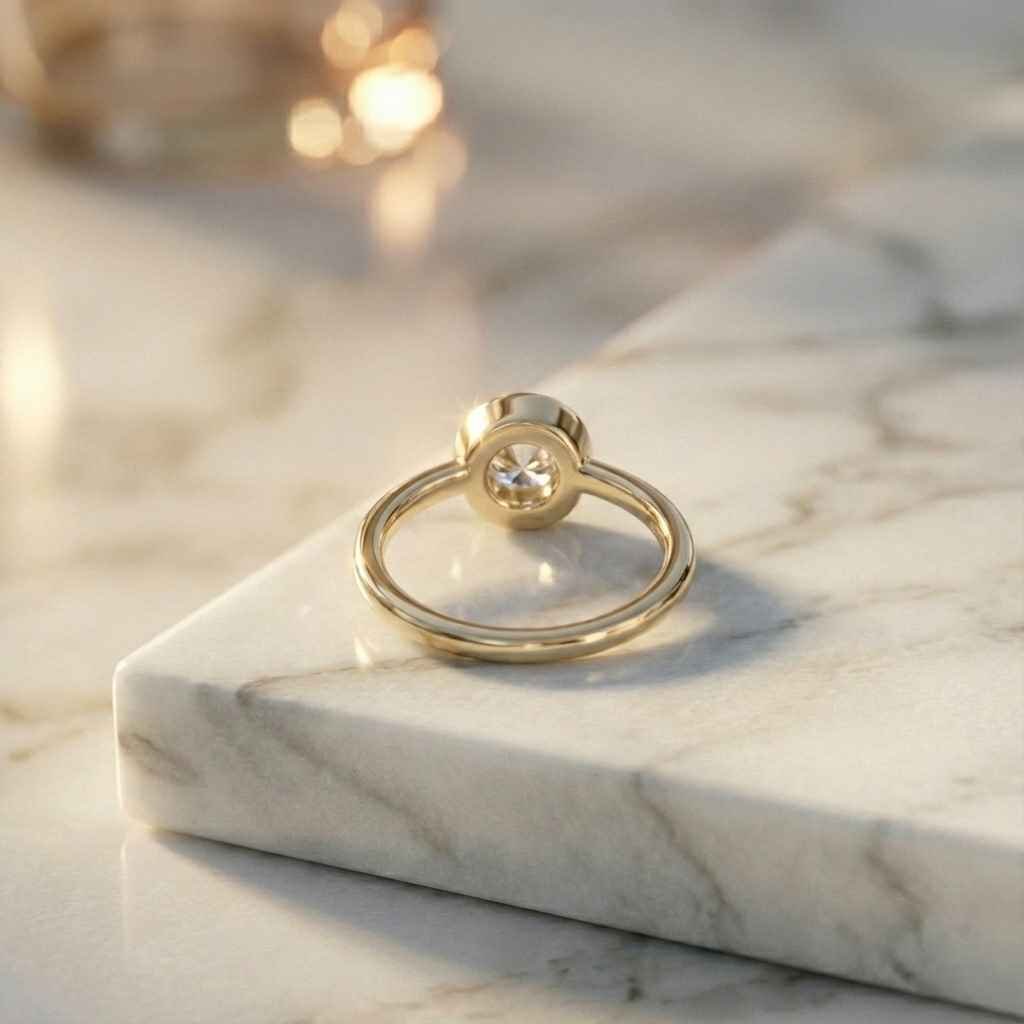 The center stone is held securely in a sleek bezel setting crafted from our proprietary 18K Silver alloy (75% pure silver). Specifically engineered for superior strength compared to traditional 925 sterling silver, this metal provides a secure, high-tensile housing that prevents stone movement while offering the rich look and weight of solid yellow gold. Perfectly minimalist and elegantly low-profile, it is an ideal choice for a sustainable engagement ring or a refined daily signature piece.