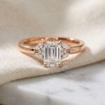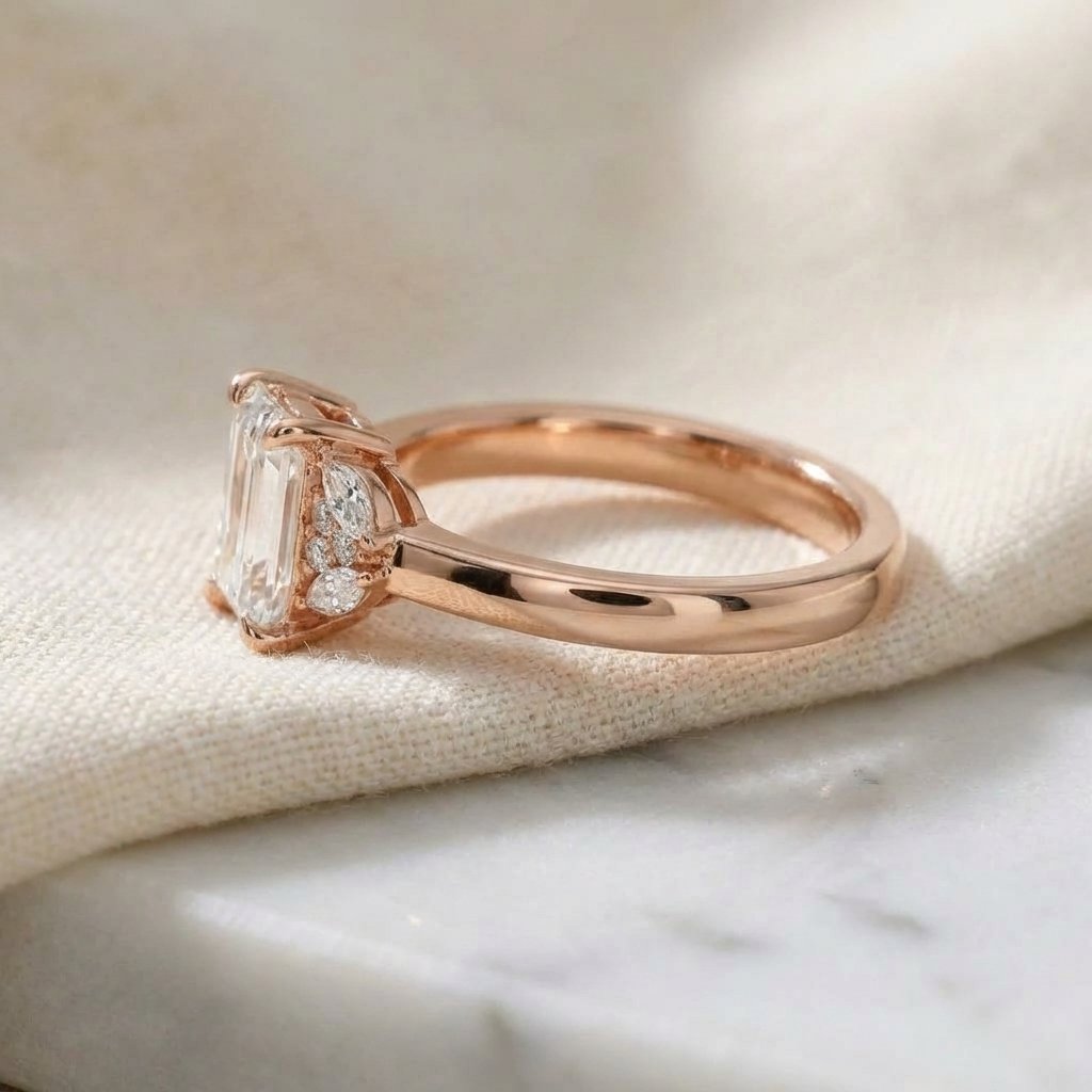 Experience the captivating blend of modern structure and feminine detailing with this 2.20 total carat weight (ctw) Emerald Cut Lab Grown Diamond Ring. The sophisticated Emerald Cut center diamond is beautifully anchored by sculptural Marquise and Round diamond clusters on either side. These delicate, floral-inspired accents create a unique and luxurious statement piece. Crafted in warm 14K Gold, this ring is perfect for those who desire a modern centerpiece with a romantic, bespoke feel. The CVD Lab Grown Diamonds ensure superior quality with near-colorless EF Color and VS1 Clarity, offering an ethical and breathtaking choice for your commitment.
