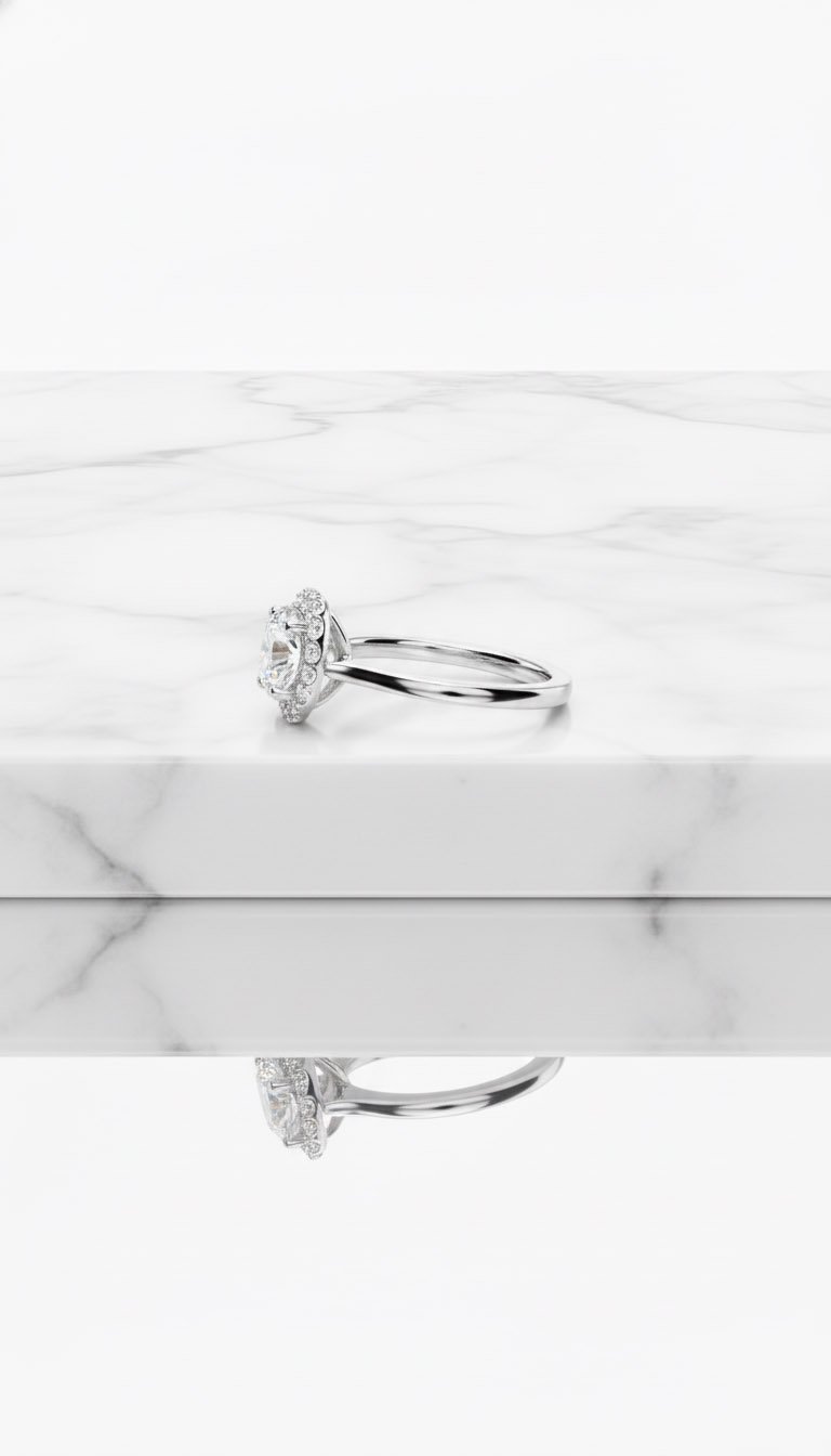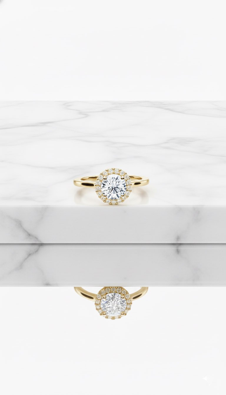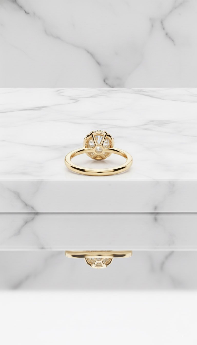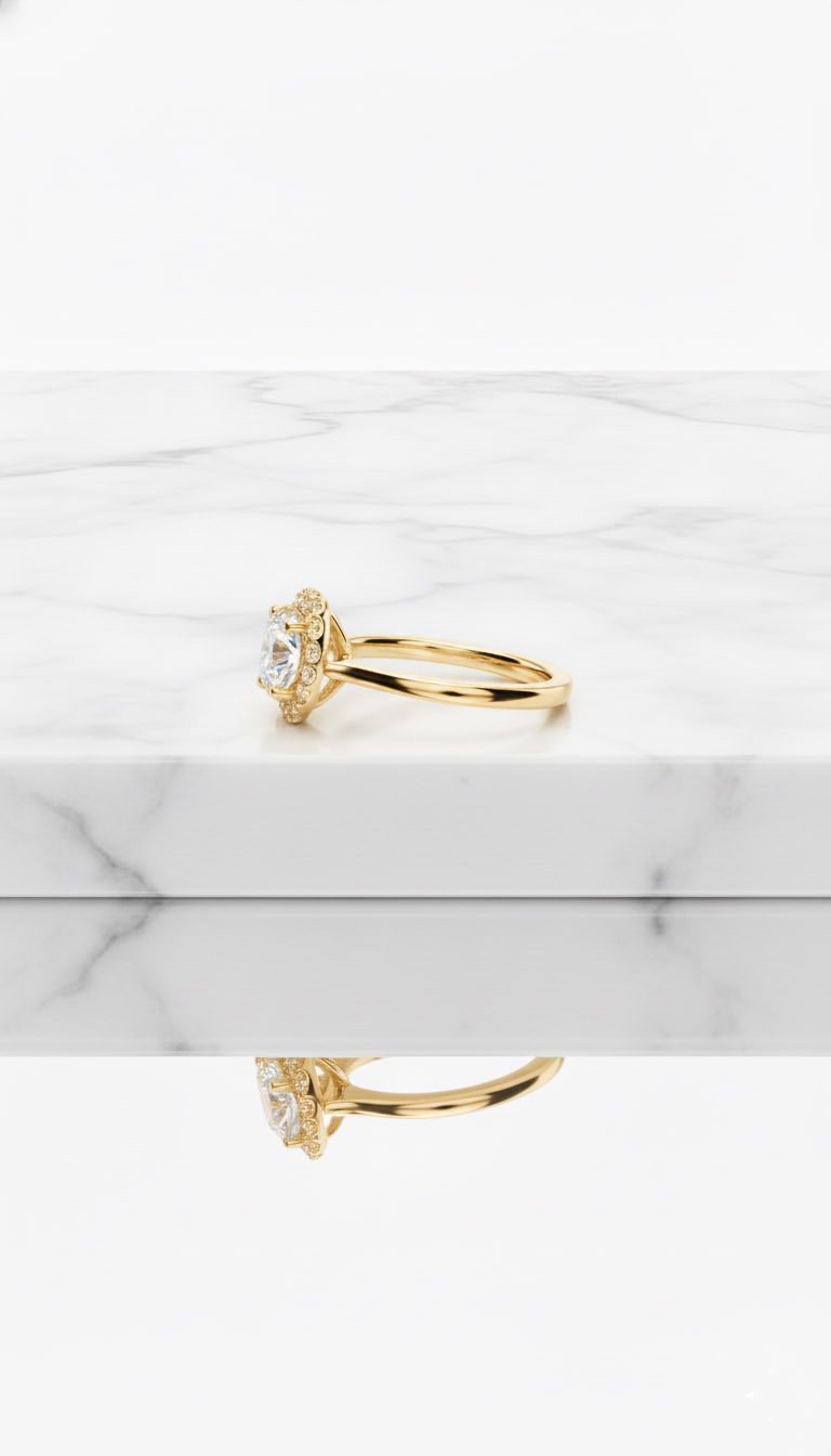 A delicate halo of 0.18ctw accent diamonds surrounds the center stone, amplifying its brilliance. This dazzling top is set upon a sleek, high-polish 14k gold band. This minimalist “halo on plain band” design offers a modern, sophisticated look that lets the diamond truly take center stage.