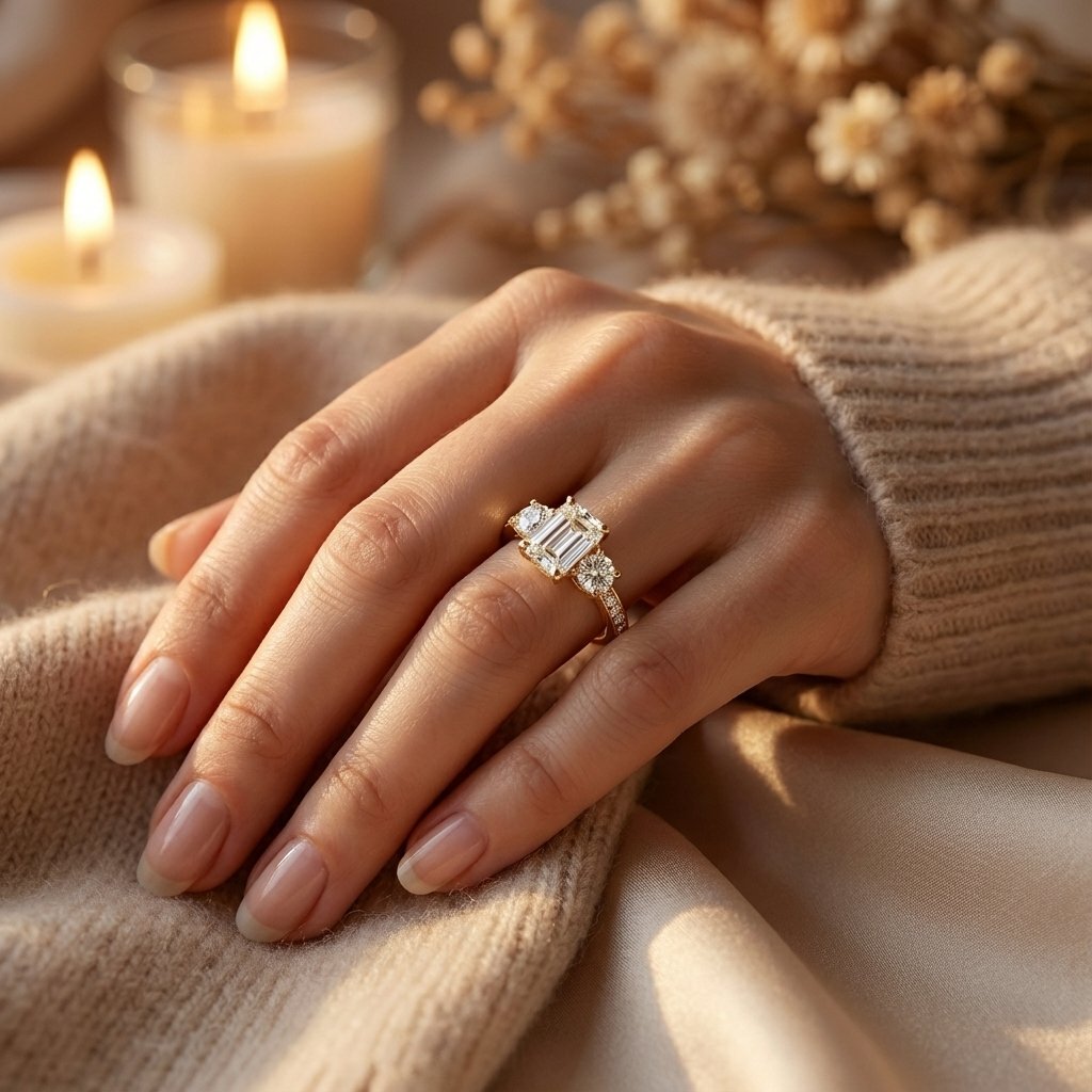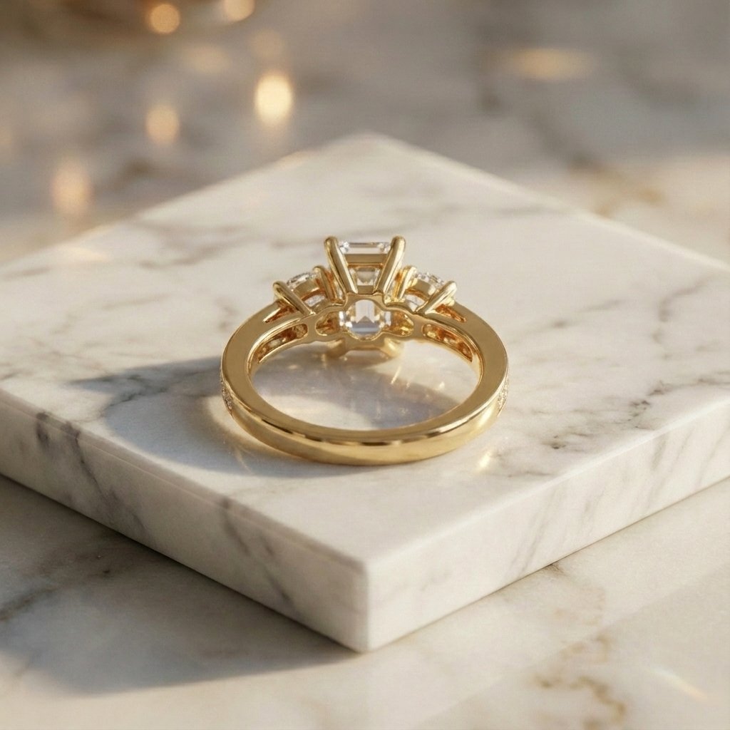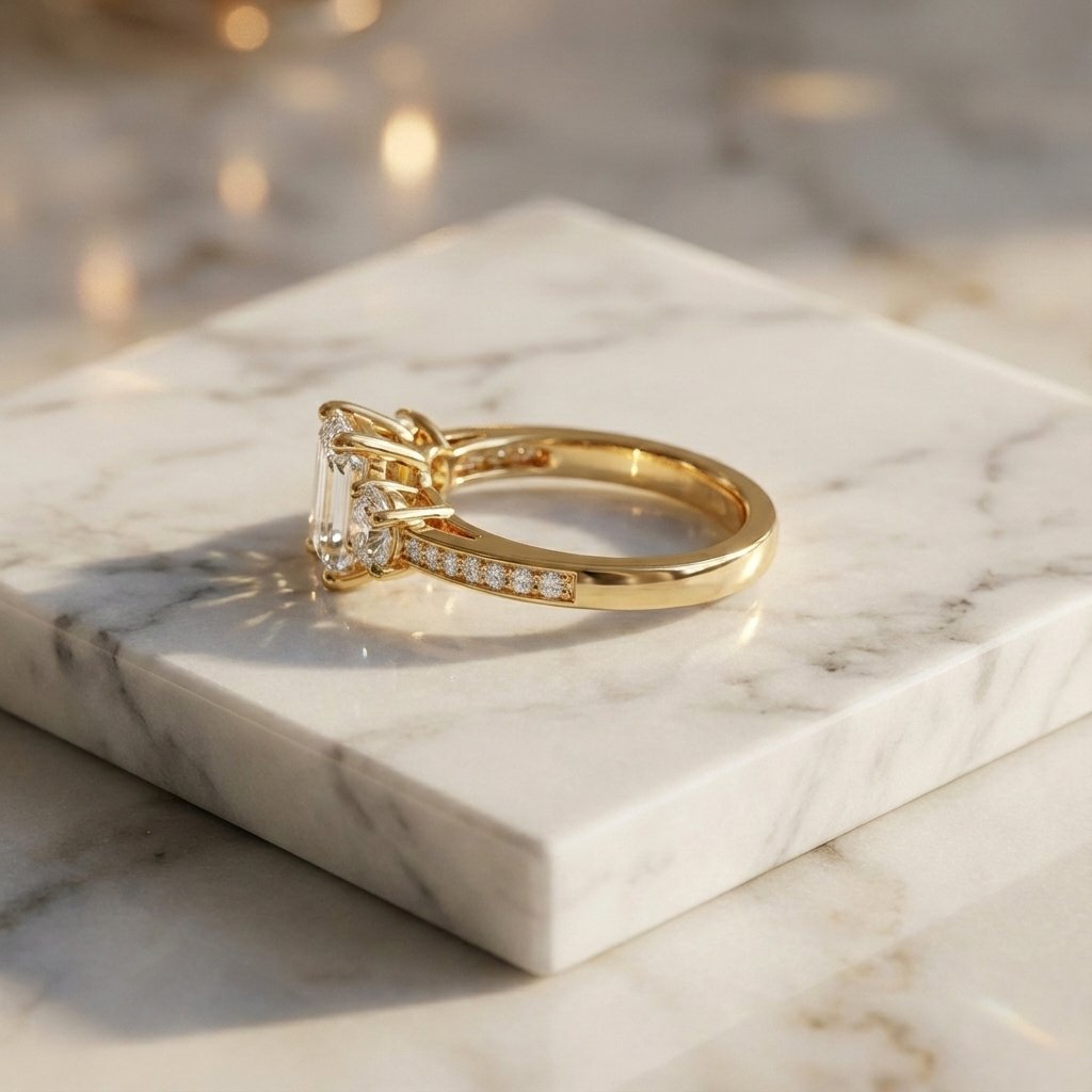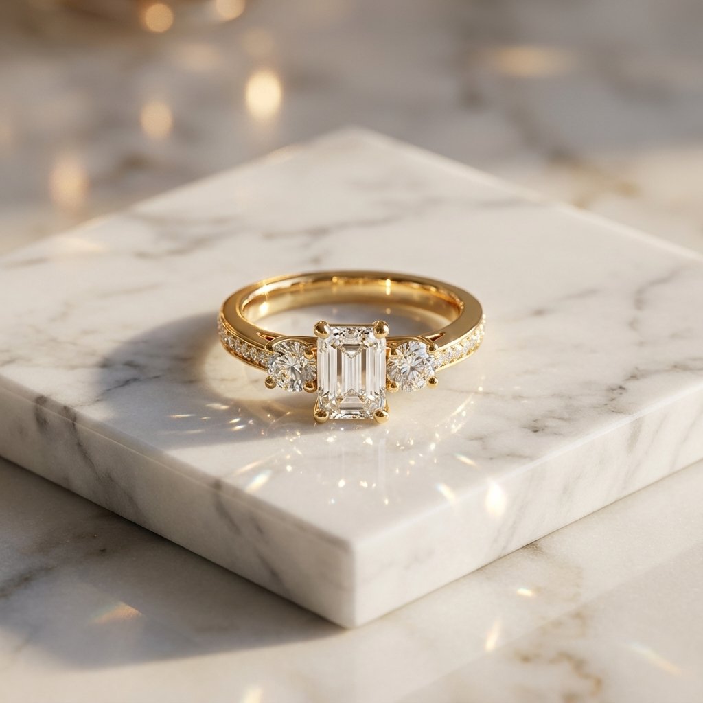 Elevate your style with the geometric brilliance of the 2.60 total carat weight (ctw) Emerald and Round Lab Grown Diamond Ring. The centerpiece of this exquisite ring is a magnificent 2.40 ct Emerald-cut diamond, celebrated for its elongated “hall of mirrors” step-cut facets that exude timeless sophistication. To add a touch of classic fire, it is flanked by two perfectly matched Round Brilliant side diamonds (0.20 ctw).