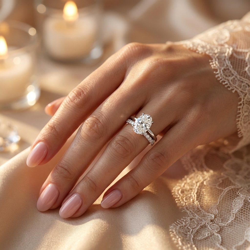 The elongated oval center diamond enhances brilliance while creating a flattering, finger-lengthening silhouette. The matching pavé wedding band adds refined sparkle, designed to sit beautifully alongside the engagement ring for a seamless, sophisticated look.
