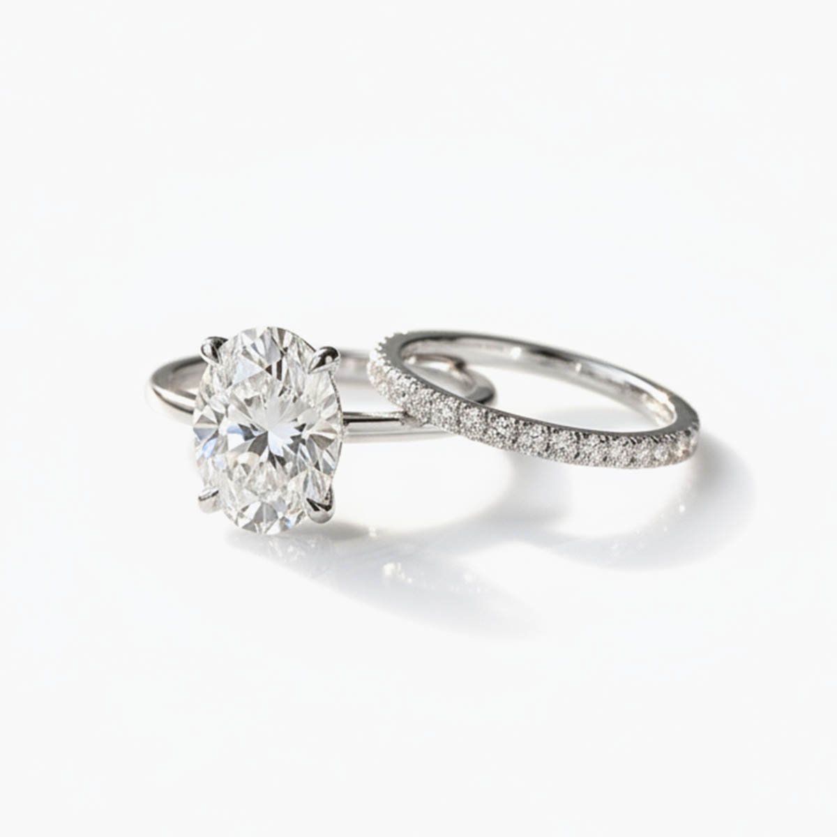 A timeless symbol of commitment and elegance, this 2 carat oval cut lab grown diamond engagement ring is paired with a delicate 0.42 carat pavé diamond band for a perfectly coordinated bridal set.