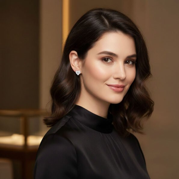 Close-up of heart-cut CVD lab-grown diamond earrings in white gold with three-prong setting