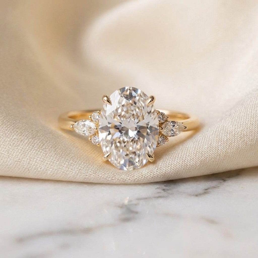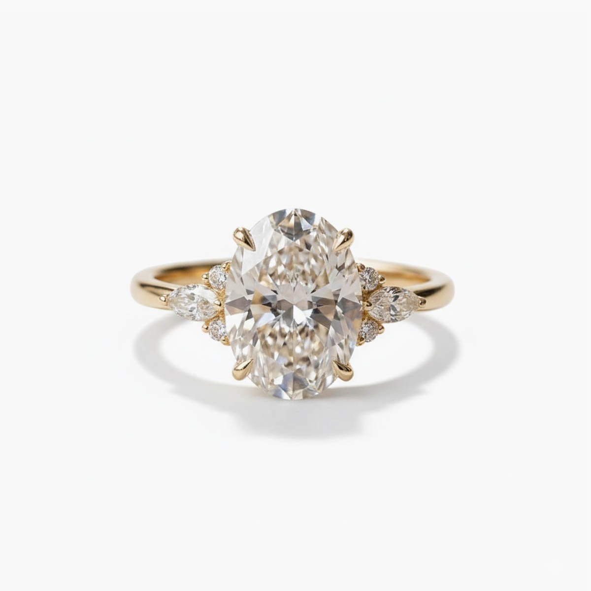 3.32ct Oval Lab Grown Diamond Engagement Ring, 14k Gold Marquise & Round Cluster Accent Bridal Ring, E-F/VS1