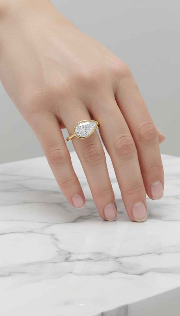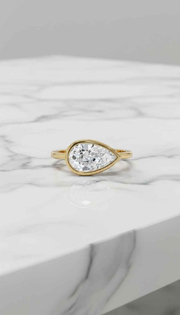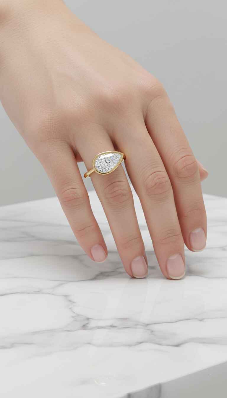 The sophisticated bezel setting fully encircles the pear-shaped diamond in precious metal, providing maximum protection for the stone and a sleek, low-profile look that’s comfortable for everyday wear.