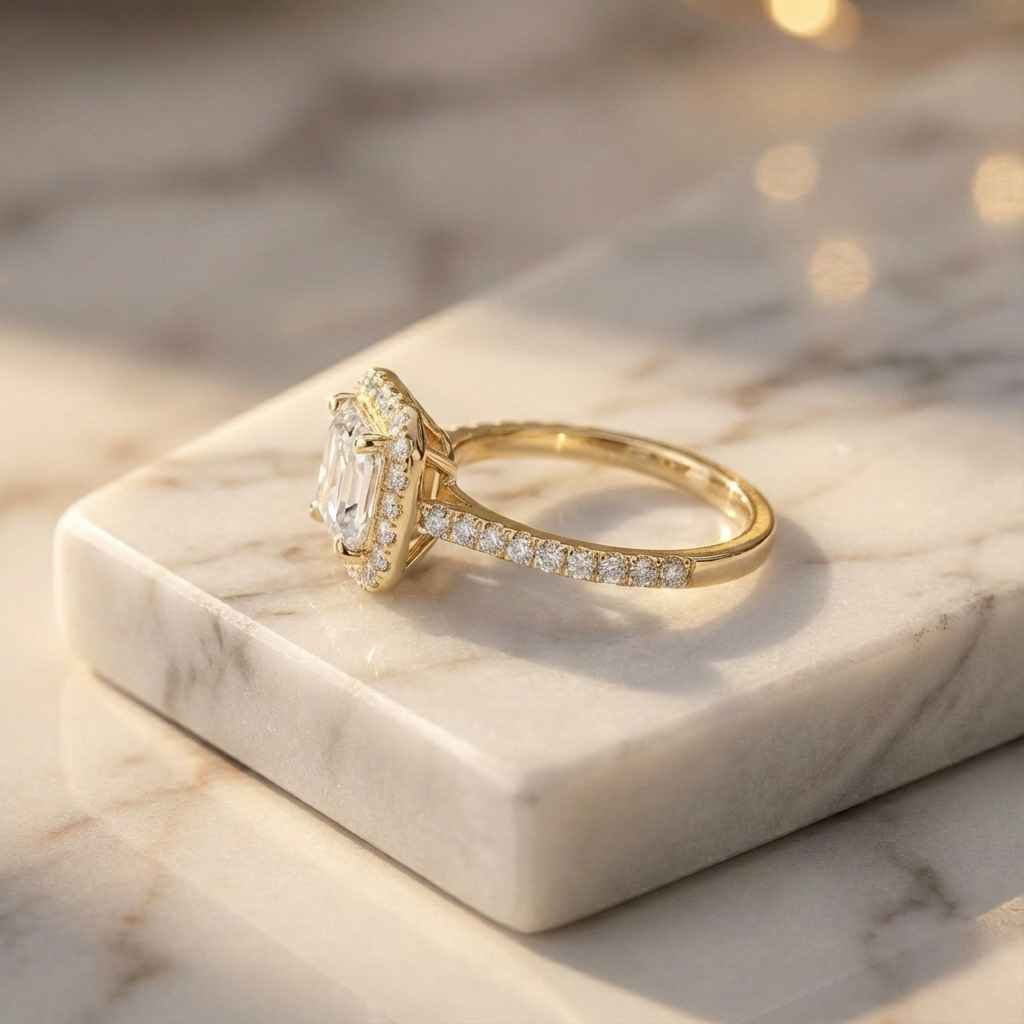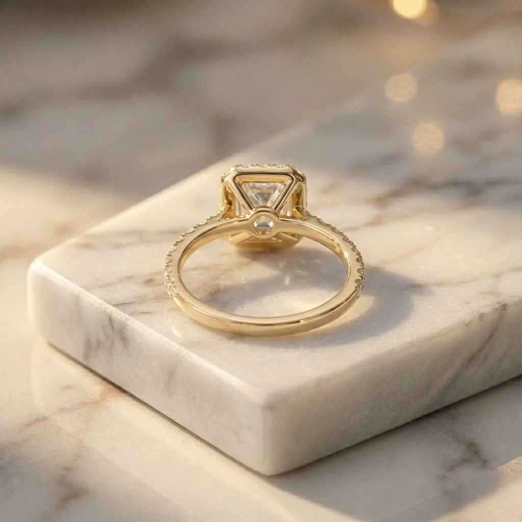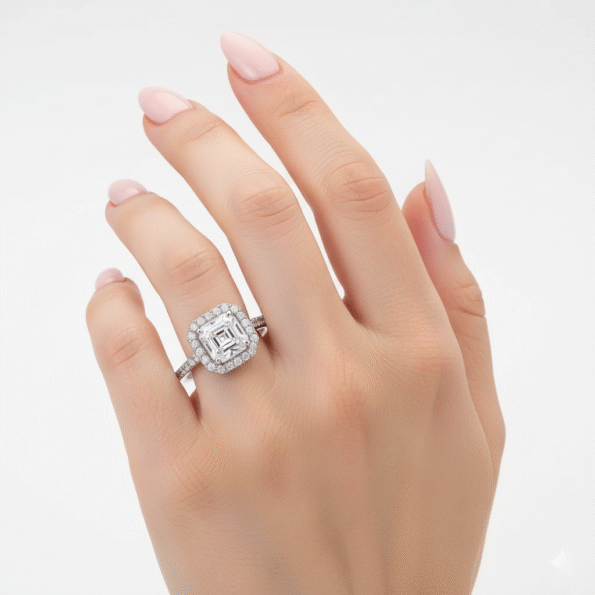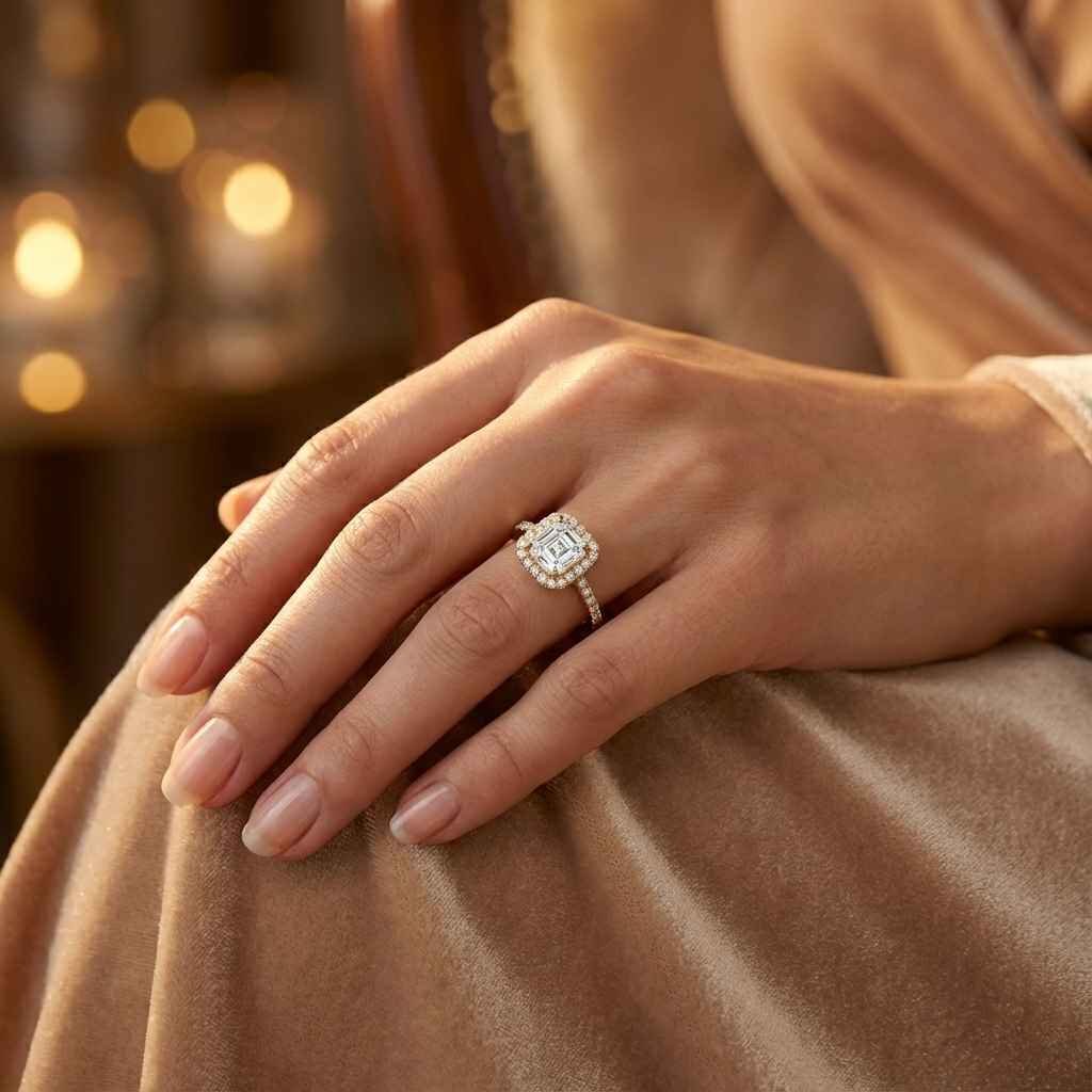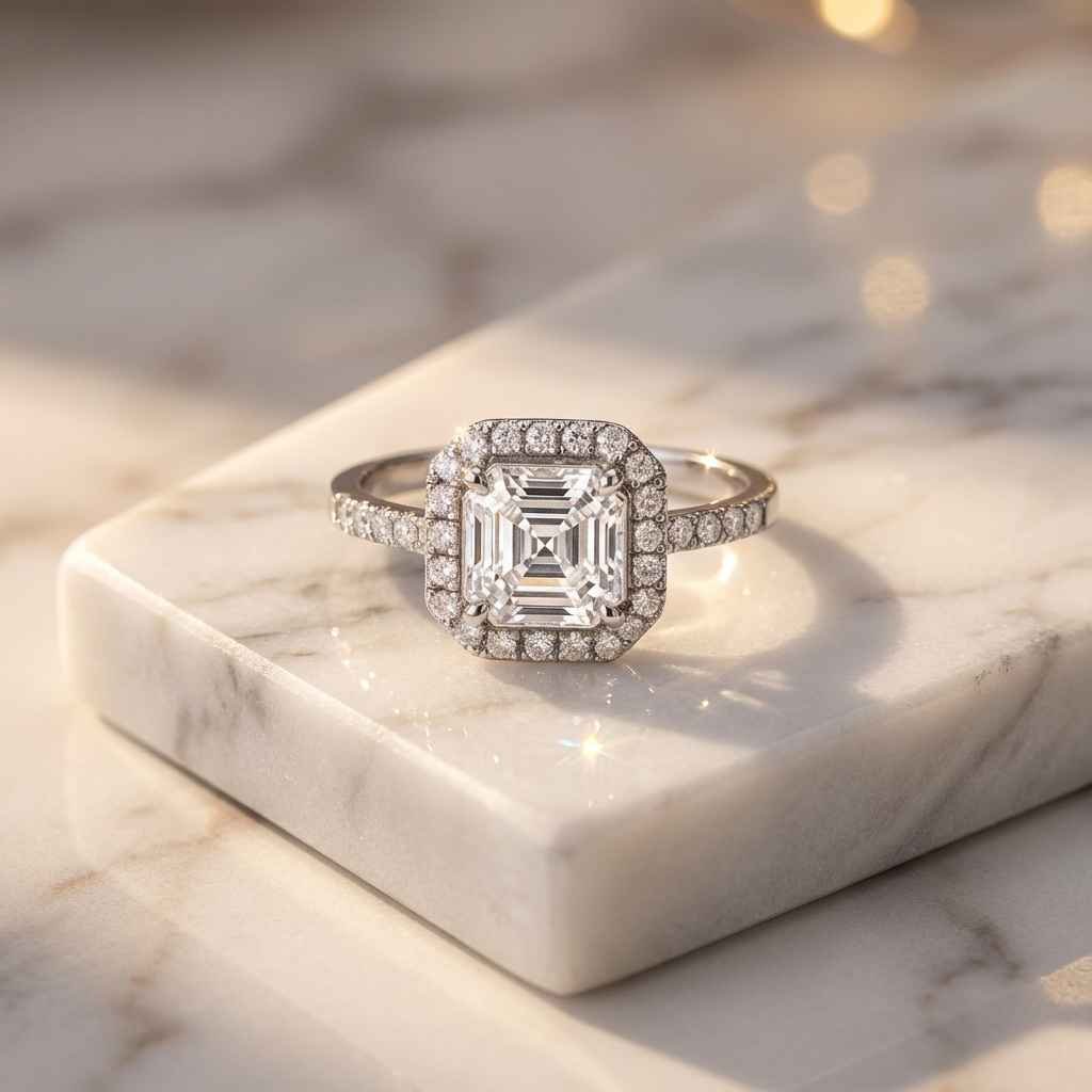 This 1.50ct Asscher cut lab-grown diamond halo ring blends geometric elegance with timeless brilliance. The step-cut center diamond is framed by a shimmering halo of round brilliant lab diamonds, creating a bold, vintage-inspired look. Crafted in 18K white gold with a clean, high-polish straight shank, this ring is available in 10K, 14K, and 18K gold. Certified by SGL (IGI available on request), it’s the ideal ethical engagement ring for the woman who values both sophistication and sustainability.