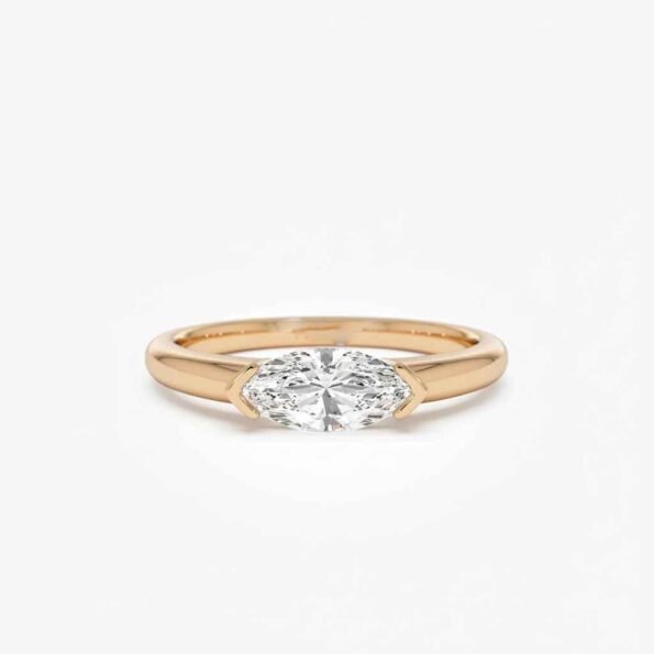 Embrace modern sophistication with our striking East-West Marquise Diamond Solitaire Ring. This contemporary design showcases a beautiful 0.75 carat total weight (CTW) Marquise-cut diamond set horizontally across the band, a style known as “East-West.” This setting not only offers a sleek, elongated look but also provides maximum security for the stone.