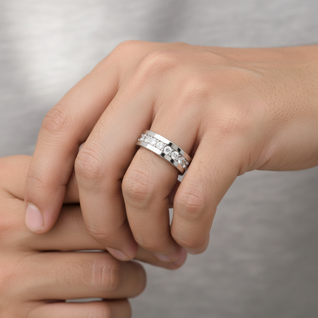 Perfect for grooms, anniversaries, or statement wear, this band brings strength and sparkle together in a refined look.
