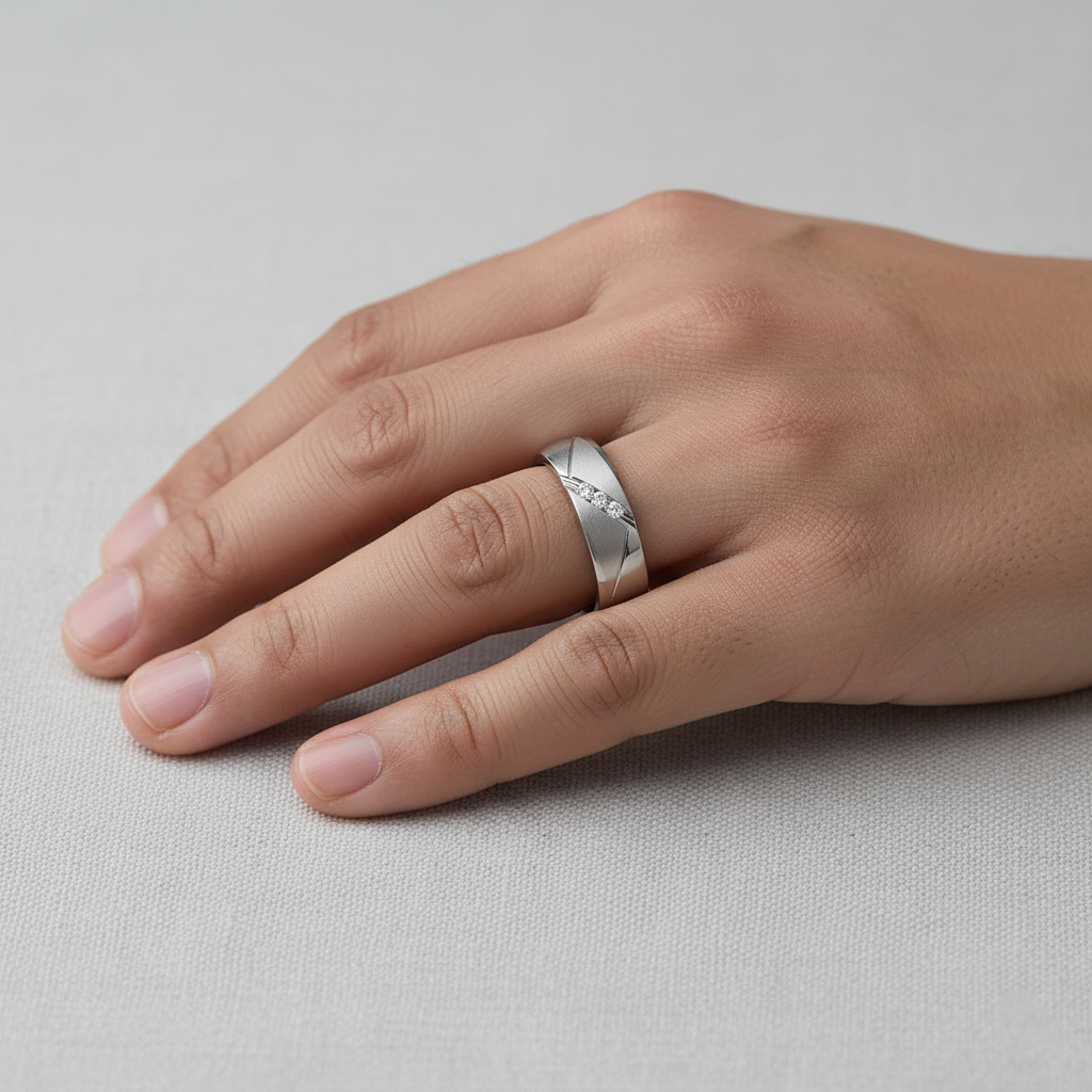 This modern 18k Silver men’s wedding band showcases a sharp diagonal groove set with 0.10 carat CVD lab-grown diamonds. The high-polished edges contrast with the matte brushed center and engraved lines, offering a sleek and contemporary appeal. Designed for the refined groom, this ring is both stylish and durable for everyday wear. SGL certification is included; IGI certification available on request.