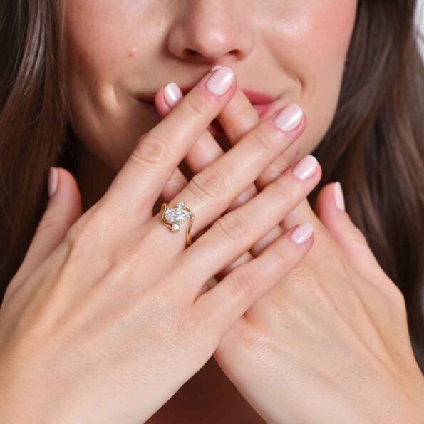 Discover unparalleled elegance with our exquisite Pear Cut Diamond Swirl Engagement Ring. This artistic piece features a stunning 1.50 carat total weight (CTW) pear-cut diamond as its radiant centerpiece, renowned for its brilliant sparkle and flattering silhouette. Complementing the main stone are two dazzling round-cut side diamonds, totaling 0.10 CTW, adding extra brilliance and symmetry to the design.