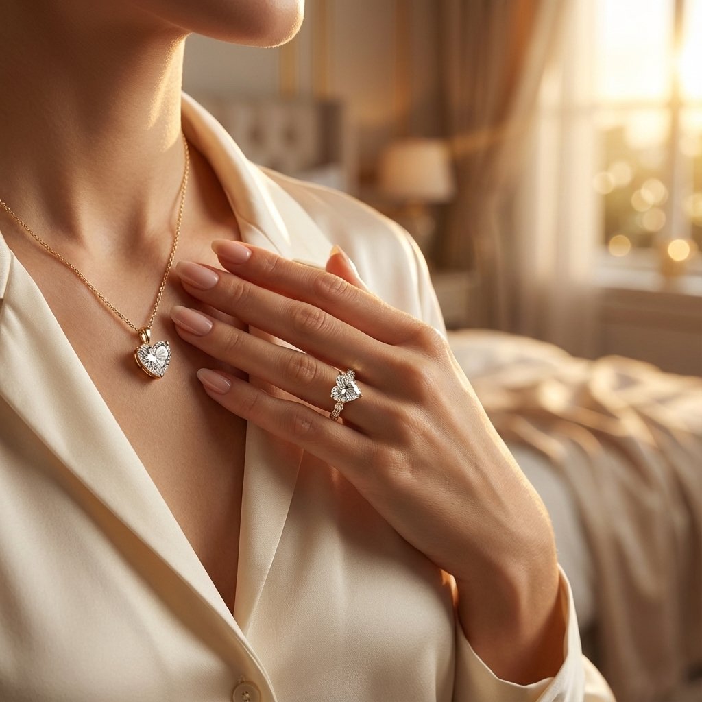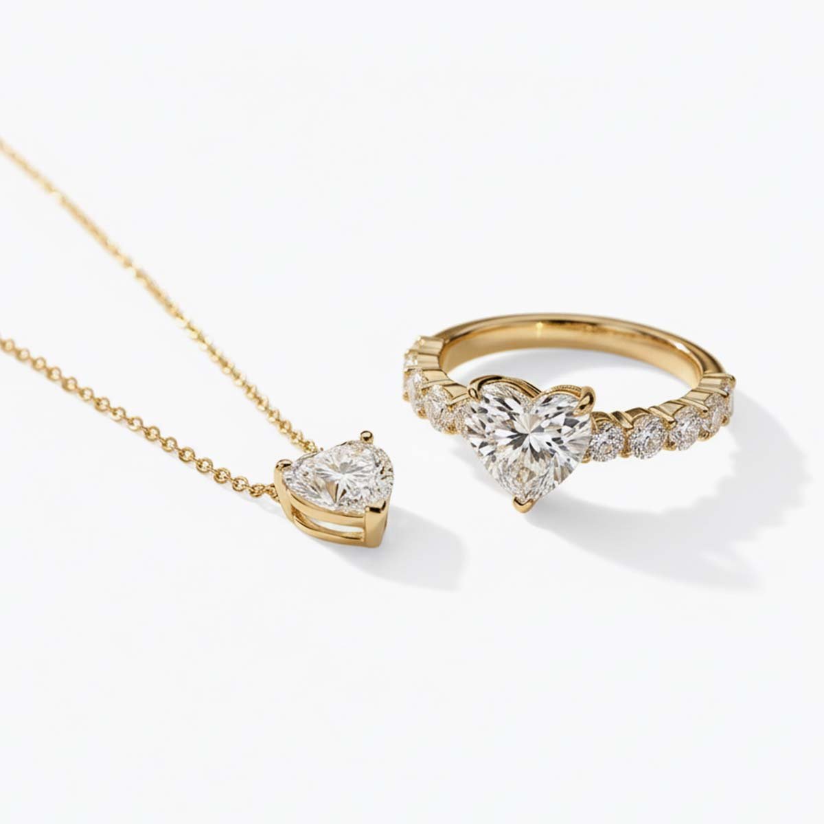 Exquisite Craftsmanship: Tapered Shank & 3-Prong Brilliance This collection is defined by its architectural elegance. The ring features a Tapered Shank—the band gracefully narrows as it approaches the center stone—drawing all eyes to the 2-carat heart diamond. Both the ring and necklace utilize a 3-prong (claw) solitaire setting, which secures the diamonds while exposing their facets for maximum light performance.
